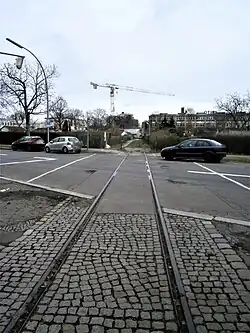 - ↑ Ein Gleisrest dieser Verlängerung kreuzt die Seidelstraße(Lage) an der Kante der JVA Tegel in Höhe Seidelstraße 44. Nach Norden noch als Trasse in der KGA ‚Am Waldessaum‘ in Richtung Flohrstraße.