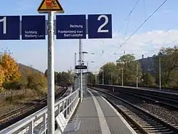 - Der andere Mittelbahnsteig liegt zwischen den Gleisen 3 und 4. Er soll mittelfristig ebenfalls erneuert und angehoben werden. Dort halten alle Züge der Main-Weser-Bahn.