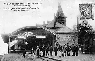 Als die Strecke 1873 in Betrieb ging, wurde der Bahnhof Chambrey der deutsche Grenzbahnhof und erhielt aus diesem Grund auch ein neues Empfangsgebäude.[3] Das gegenüberliegende Pendant auf französischer Seite war der Bahnhof Moncel. 1881 kauften die Reichseisenbahnen in Elsaß-Lothringen den etwa 12 km langen Streckenabschnitt von der Grenze bis Château-Salins und damit auch den Bahnhof Chambrey.[2]