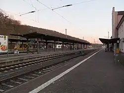 Es gibt fünf Bahnsteiggleise an einem Haus- und zwei Mittelbahnsteigen. Alle sind teilweise überdacht. Ein weiterer Bahnsteig im Osten, der von den Zügen der Nebenstrecken genutzt wurde, ist zwar noch vorhanden, aber gleislos und weitgehend überwachsen. Die Bahnsteige sind durch eine Unterführung miteinander verbunden. Aufzüge fehlen jedoch (Stand Okt. 2023). Der Zugang zum östlichsten Bahnsteig ist heute nicht mehr möglich.