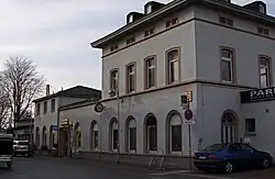 Das Empfangsgebäude ist ein traufständiger, doppelgeschossiger Putzbau mit Walmdach, beidseitig mit flacheren Anbauten.