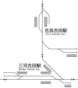 Der Bahnhof steht am östlichen Rand des Stadtteils Kirachō Yoshida, etwa einen halben Kilometer nördlich der Küste der Mikawa-Bucht, und ist von Wohnvierteln umgeben. Baulich handelt es sich um einen Keilbahnhof, auch wenn nur noch zwei der ursprünglich drei hier endenden Bahnstrecken in Betrieb sind. Die Meitetsu Nishio-Linie führt nach Norden und die Meitetsu Gamagōri-Linie nach Osten, während die westwärts führende Meitetsu Mikawa-Linie stillgelegt wurde.