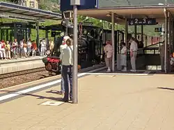 Um 1900 besaß der Bahnhof insgesamt acht Gleise. Im südwestlichen Bereich befanden sich mehrere Stumpfgleise. Über Jahrzehnte blieben die Gleisanlagen im Wesentlichen unverändert. Anfang der 1960er Jahre fand während der Elektrifizierungsarbeiten eine Veränderung der Unterführungen, Gleisanlagen und Sicherheitseinrichtungen statt.[32] So wurde beispielsweise der zwischen den Gleisen 1 und 2 befindliche Inselbahnsteig durch einen neuen Mittelbahnsteig zwischen den Gleisen 2 und 3 ersetzt. Ende der 1980er Jahre wurden die Gleisanlagen deutlich reduziert, der Bahnhof verfügt seitdem nur noch über drei Gleise. Gleis 1 am Hausbahnsteig dient sowohl Güterzügen als Überholgleis als auch den Zügen des Kuckucksbähnels, die Gleise 2 und 3 dienen der Hauptstrecke.[33][34]