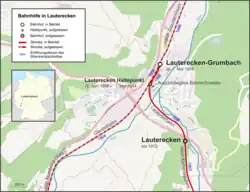 Bei Eröffnung der Lautertalbahn im Jahr 1883 erhielt Lauterecken einen Bahnhof am südwestlichen Stadtrand.[5][6] Dabei fand bei der Standortwahl Beachtung, dass ein Anschluss der Strecke an die bereits damals diskutierte Glantalbahn möglichst einfach realisierbar ist.[7]