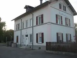 Beim früheren Empfangsgebäude, das um 1870 errichtet wurde, handelt es sich um einen so genannten „Typenbau“ aus Backstein. Stilistisch ist er dem so genannten Spätklassizismus zuzuordnen. Es stammt aus der Eröffnungszeit des Bahnhofs und steht unter Denkmalschutz.[20] Nach der vorübergehenden Einstellung des Personenverkehrs im Jahr 1984 wurde es verkauft; für den Bahnbetrieb besitzt es seither keine Bedeutung mehr.[16] Es dient inzwischen als Wohnhaus.