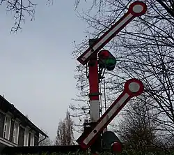 ![]() Straßenseite mit Bahnhofsschild und Bahnhofsuhr