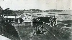 Shinagawa ist der älteste Bahnhof Japans und steht heute noch an seinem ursprünglichen Standort, wenn auch von der ursprünglichen Anlage nichts erhalten geblieben ist. Die Arbeiten am ersten Empfangsgebäude, einem eingeschossigen Bauwerk im westlichen Stil, begannen am 10. September 1871 und waren am 20. Januar 1872 abgeschlossen; die Kosten beliefen sich auf 5472 ryō.[8] Aufgrund von Bauverzögerungen musste der erste Teil der Tōkaidō-Hauptlinie (Japans erste Eisenbahnstrecke) in zwei Etappen eröffnet werden. Am 12. Juni 1872 wurde der Bahnbetrieb provisorisch zwischen Shinagawa und Yokohama (heute Sakuragichō) aufgenommen. Kaiser Meiji eröffnete die Bahnlinie offiziell am 14. Oktober 1872, zusammen mit dem noch fehlenden Abschnitt von Shinagawa nach Shimbashi. Die Trasse verlief damals unmittelbar an der Bucht von Tokio entlang, heute liegt die Küste aufgrund umfangreicher Landgewinnung über einen halben Kilometer weiter östlich.[9]