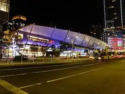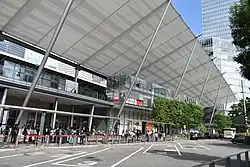 An der Ostseite der Anlage steht ein dreiteiliger Gebäudekomplex. Er besteht aus zwei baugleichen Wolkenkratzern namens GranTokyo und dem dazwischen liegenden Mittelteil namens GranRoof, das als zweites Empfangsgebäude dient. Gemäß den verantwortlichen Architekten Helmut Jahn und Werner Sobek sollen die Wolkenkratzer „in Licht umhüllte Kristalltürme“ symbolisieren, während der Mittelteil ein „Segel aus Licht“ darstellen soll.[18] Beide Wolkenkratzer sind 205 m hoch; der nördliche zählt 43 Stockwerke, der südliche 42. Jeweils das zweite Stockwerk der beiden Türme ist mit dem zweiten Stockwerk des viergeschossigen Mittelteils verbunden. Dessen prägendes Element ist das 234 Meter lange Vordach, das als großes flaches Textilpaneel konzipiert ist, das in einer geraden Linie entlang der Fahrbahnkante befestigt ist und auf Stahlrahmen mit unterschiedlichen Höhen und Winkeln im Abstand von 18 Metern aufliegt. Das Paneel ist von der Stahlkonstruktion versetzt, sodass die Oberfläche des Vordachs eine durchgehende leuchtende Fläche bildet.[19] Ein dritter Haupteingang im Nordosten ist seit 2007 in den Sapia Tower integriert und ermöglicht die Erschließung vom benachbarten Stadtteil Nihonbashi her.[20]