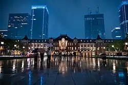 Das von Tatsuno Kingo entworfene und im Jahr 1914 fertiggestellte Empfangsgebäude an der Westseite gehört zu den markantesten und bekanntesten Bauwerken der Stadt, weil es sich mit seinen Fassaden aus charakteristischen roten Mauerziegeln deutlich von den Glas- und Stahlfassaden der benachbarten Wolkenkratzer abhebt. Oft wird es mit dem 1889 von Pierre Cuypers erbauten Bahnhof Amsterdam Centraal verglichen. Allerdings gibt es keine Hinweise darauf, dass Tatsuno jemals in den Niederlanden war und in seinen Aufzeichnungen finden sich auch keine Hinweise auf Amsterdams Hauptbahnhof. Vielmehr sind es die seitliche Anordnung der Gebäude, ihre Funktion und ihr hauptsächliches Baumaterial, die fast zwangsläufig zu einer ähnlichen Form geführt haben.[12] Das Marunouchi-Empfangsgebäude präsentiert sich als fünfteiliges Neorenaissance-Bauwerk mit drei Stockwerken, das sich von Norden nach Süden dem Gleisfeld entlang erstreckt. Es ist etwa 270 Meter lang und besitzt eine Grundfläche von rund 7800 m² sowie eine Geschossfläche von etwa 23.800 m². Die maximale Höhe beträgt 34,8 Meter, die Traufhöhe 16,7 Meter. An das südliche Ende des Gebäudes angebaut ist das diagonal abgewinkelte Bahnhofshotel (das Tokyo Station Hotel). Zusammen mit den Anbau beträgt die Gesamtlänge des Gebäudekomplexes 335 Meter.[13] Der 6500 m² große Bahnhofsvorplatz wurde in den Jahren 2014 bis 2017 zu einer Fußgängerzone umgestaltet. Er ist mit weißem Granit gepflastert und wird teilweise von Zelkoven gesäumt. Auf dem Platz steht eine von Asakura Fumio geschaffene Statue, die den Eisenbahningenieur Inoue Masaru darstellt.[14]