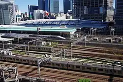 Auch für alle nachfolgend genannten Bahnlinien ist JR East zuständig. Die Tōkaidō-Hauptlinie dient überwiegend dem beschleunigten Pendlerverkehr über mittlere Entfernungen. Es verkehren in dichtem Takt Eilzüge in Richtung Atami bzw. Odawara. Hinzu kommen die Shōnan Liner (Eilzüge während der Verkehrsspitze mit reservierten Sitzplätzen), touristische Ausflugszüge sowie der zur Izu-Halbinsel verkehrende Regionalschnellzug Odoriko.[1] Die meisten Nahverkehrszüge, deren Endstation früher der Bahnhof Tokio war, verkehren seit 2015 weiter auf der Ueno-Tokio-Linie, einer Viaduktstrecke über den Gleisen der Tōhoku-Shinkansen zum Bahnhof Ueno. Sie werden dadurch mit der Utsunomiya-Linie, der Jōban-Linie und der Takasaki-Linie im nördlichen Teil der Metropolregion verknüpft.[2][1]