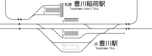 Im Bahnhof Toyokawa selbst wird kein Güterverkehr mehr abgewickelt, doch nördlich davon beginnt ein rund zweieinhalb Kilometer langes Anschlussgleis, das zu einer bedeutenden Fabrik des Schienenfahrzeugherstellers Nippon Sharyō führt. Auf dieser Zweigstrecke verlassen Schienenfahrzeuge die Produktionsstätte oder werden dorthin zur Wartung gefahren.[4] Der Kopfbahnhof ist die Endstation der Meitetsu Toyokawa-Linie. Er besitzt zwei stumpf endende Gleise an einem rund zur Hälfte überdachten Mittelbahnsteig. Gleis 1 kann Züge mit sechs Wagen aufnehmen, Gleis 2 solche mit vier Wagen. Das Empfangsgebäude ist auf den westlichen Bahnhofsvorplatz ausgerichtet. Es gibt keine Gleisverbindung zur Iida-Linie.