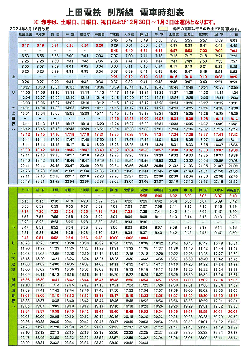 - ↑ Fahrplan Bessho-Linie. (PDF) Ueda Dentetsu, 2024, abgerufen am 29. Oktober 2024 (japanisch).