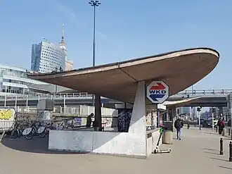 Ursprünglich konnte man den unterirdisch liegenden Bahnsteig über zwei überdachte Treppen erreichen. Der auf der gegenüberliegenden Seite der Al Jerozolimskie gelegene, kleinere Eingang wurde 1993 beim Bau eines Bürohauses abgerissen. Der noch bestehende Zugang zeichnet sich durch ein Betondach aus, das Schmetterlingsflügeln oder einem riesigen Pfannkuchen (so im Volksmund genannt) ähnelt.[2] Mit weichen Kurven der Betonschale erhielt das Gebäude eine individuelle Form. Als Gebäude der Warschauer Nachkriegsmoderne gilt es als repräsentatives Beispiel für die Ästhetik der 1960er Jahre und dokumentiert das Schaffen von Arseniusz Romanowicz und Piotr Szymaniak – den beiden wichtigsten Gestaltern der Eisenbahnarchitektur in Warschau in den Nachkriegsjahren. Die Architektur des Stalinismus wurde von der polnischen Architektur der Moderne abgelöst.[3]