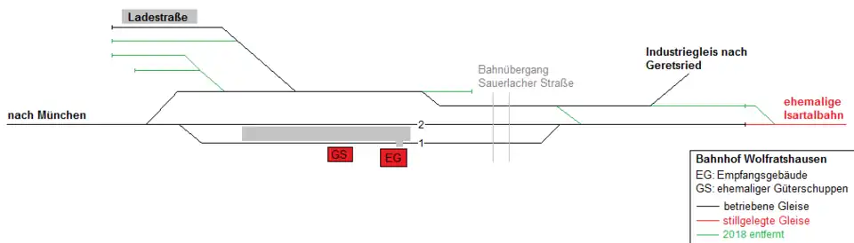 Der Wolfratshausener Bahnhof besitzt zwei Bahnsteiggleise an einem 140 Meter langen und 76 Zentimeter hohen Mittelbahnsteig,[18] der über einen schienengleichen Übergang über Gleis 1 barrierefrei mit dem Empfangsgebäude verbunden ist. Der Bahnsteig ist nicht überdacht und verfügt über digitale Zugzielanzeiger. Neben den Bahnsteiggleisen 1 und 2 befindet sich das bahnsteiglose Gleis 3, von dem südlich des Bahnübergangs der Sauerlacher Straße das Anschlussgleis nach Geretsried abzweigt. Südlich der Abzweigung befand sich bis 2018 eine zweigleisige Abstellanlage, von der nur noch ein Gleis vorhanden ist. Nach dem Prellbock am Ende der Abstellanlage führte das Gleis der ehemaligen Isartalbahn noch etwa 450 Meter weiter nach Süden, bevor es endet. Im nördlichen Teil des Bahnhofs zweigten vom Gleis 3 vier weitere Abstellgleise ab, von denen seit 2018 nur noch ein Gleis vorhanden ist und noch zum Verladen von Gütern genutzt werden kann.