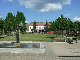 im Vordergrund der Fischerbrunnen, dahinter der Bahnhofsvorplatz mit den Pergolen; im Hintergrund das Bahnhofsgebäude.