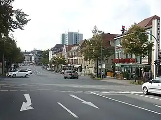 Auf der westlichen Straßenseite hatten einige Häuser das „Dritte Reich“ überstanden. Das prägnante Gasthaus „Zum goldenen Schwan“ (Bahnhofstraße 1), dessen Fachwerk 1904 freigelegt worden war,[20] überlebte den Bombenkrieg jedoch nicht. Die Villa des Bankiers Friedrich Feustel,[25] zuletzt im Besitz von Adolf von Groß, wurde in April 1945 nur teilweise zerstört. Endgültig abgebrochen wurde sie in den 1960er Jahren, um dem Neubau eines Hochhauses („Barmenia-Haus“) zu weichen.[26] Erhalten blieb das Haus Bahnhofstraße 7, ein giebelständiger, zweigeschossiger Sandsteinquaderbau mit Neorenaissance-Fassade, Satteldach und Zwerchhaus von 1887. Dort hatte im frühen 20. Jahrhundert das „Erste optisch-mechanisch physikalische elektrische Institut“ des Hoflieferanten Julius Heuberger seinen Sitz.[27]