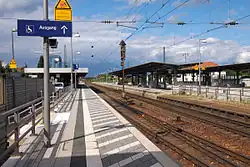 Der Bahnhof Germersheim liegt am nördlichen Stadtrand von Germersheim. Seine Gleisanlagen befinden sich bereits teilweise auf der Gemarkung von Lingenfeld. Das ursprüngliche, östlich der Bahngleise liegende Empfangsgebäude steht zudem unter Denkmalschutz.[12] 1864 war er zunächst Endbahnhof; mit Eröffnung der Bahnstrecke Germersheim–Landau wurde er zum Kopfbahnhof. Dieser Zustand änderte sich erst mit Durchbindung der Bahnstrecke Schifferstadt–Germersheim nach Wörth in Richtung Süden im Jahr 1876. Ein Jahr später wurde die bislang in Rheinsheim endende Bruhrainbahn bis nach Germersheim durchgebunden. Dadurch war er zunächst in Ost-West-Richtung ein wichtiger Knotenbahnhof im Fernverkehr, ab 1906 auch in Nord-Süd-Richtung. Als Elsaß-Lothringen nach dem Ersten Weltkrieg an Frankreich zurückfiel, verlor er für den Nord-Süd-Verkehr an Bedeutung. Seit 2006 ist er in das Netz der S-Bahn RheinNeckar und seit 2010 auch in das Netz der Stadtbahn Karlsruhe eingebunden. In diesem Zusammenhang wurden seine Bahnsteige behindertengerecht ausgebaut.