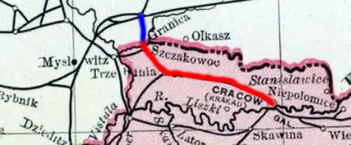 Der südliche Abschnitt wurde bereits ein halbes Jahr von der Krakau-Oberschlesischen Eisenbahn (KrOs) eröffnet, nachdem diese auf Initiative des Krakauer Senats 1844 ins Leben gerufen wurde. Die KrOs eröffnete am 13. Oktober 1847 ihre Stammstrecke zwischen Krakau, Szczakowa und dem preußischen Grenzort Myslowitz (Mysłowice).[3] Mit der Vollendung der aus Warschau kommenden Strecke richtete sie von Szczakowa eine kurze Stichstrecke über die Weiße Przemsa (Biała Przemsza), welche den Grenzfluss darstellte, zum Bahnhof Granica ein. Mit ihrer Fertigstellung stellte die Bahn die erste direkte Schienenverbindung zwischen den beiden Kaiserreichen Russland und Österreich dar.