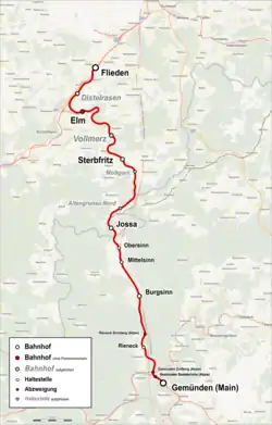 Die Strecke zweigt im Bahnhof Flieden von der Kinzigtalbahn von Fulda kommend ab. Von hier verläuft sie durch die Ausläufer von Spessart und Rhön, genauer: zunächst am Ostabhang der Furche des Kautzer Wassers über den Höhenzug des Distelrasens bis über den Ort Schlüchtern. Ein kleines Stück weiter erreicht man den Betriebsbahnhof Elm, auf den eine Kehrschleife nordwärts im Elmbachtal und weitere kurvige Seitentalausfahrungen, unter anderem über den aufgelassenem Bahnhof Vollmerz, zum Aufstieg in den Talschluss der Kinzig im noch bedienten Bahnhof Sterbfritz folgen. In Sterbfritz wird der Geländerücken zum Sinntal mit dem Sterbfritz-Tunnel durchbrochen. An der Westflanke des Sinntals geht es in Hanglage südwärts, wobei sich auf der anderen Talseite ab der aufgelassenen Station Mottgers die Schnellfahrstrecke Hannover–Würzburg dazugesellt. Die Bahnstrecke erreicht nahe Jossa das Sinntal. Bei Obersinn, bereits in Bayern, wird die Sinn durch ein 171,6 Meter langes Viadukt, das fünf Bögen und vier Pfeiler umfassende Sinntal-Viadukt überquert. Die Strecke folgt dann größtenteils der Ostflanke des Sinntals und verläuft teilweise gebündelt mit der Schnellfahrstrecke Hannover–Würzburg. Eine Verknüpfung mit der Schnellfahrstrecke besteht südlich von Burgsinn im Betriebsbahnhof Burgsinn. Mit Erreichen des Maintals, an dessen Ostseite der Bahnhof Gemünden südlich des Ortskerns errichtet wurde, ist noch die Fränkische Saale an ihrer Mainmündung vor dem Nördlichen Bahnhofskopf zu passieren.