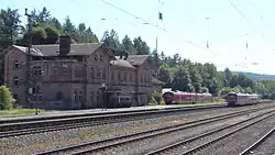 - Am 6. Mai 1872 wurde am Kopfende des Bahnhofs Elm die von Gemünden kommende Fulda-Main-Bahn angeschlossen.[8] Elm wurde damit zum Durchgangsbahnhof, die Bahnstrecke Flieden–Gemünden entstand. Allerdings mussten die Züge der Frankfurt-Bebraer Bahn hier weiterhin „Kopf machen“. Dies änderte sich erst mit der Inbetriebnahme des Schlüchterner Tunnels 1914, der den Distelrasen unterfährt.