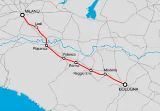 | Streckennummer (RFI): | 35 (Mailand–Piacenza) 82 (Piacenza–Bologna) | ||||||||||||||||||||||||||||||||||||||||||||||||||||||||||||||||||||||||||||||||||||||||||||||||||||||||||||||||||||||||||||||||||||||||||||||||||||||||||||||||||||||||||||||||||||||||||||||||||||||||||||||||||||||||||||||||||||||||||||||||||||||||||||||||||||||||||||||||||||||||||||||||||||||||||||||||||||||||||||||||||||||||||||||||||||||||