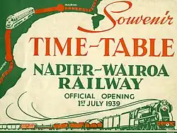 Seit 1912 wurde eine Strecke von Napier nach Wairoa vorangetrieben. Auch hier unterbrach der Erste Weltkrieg die Arbeiten, so dass die Strecke erst im Dezember 1922 bis Eskdale und erst am 6. Oktober 1930 bis Putorino fertig gestellt war. Naturkatastrophen und mangelnder Wille in der Politik, das Projekt fertigzustellen, zeigten hier ihre Auswirkungen. Das Hawke’s-Bay-Erdbeben von 1931 führte dazu, dass der Abschnitt Napier–Putorino nicht mehr befahren werden konnte. Nach dem Erdbeben wurden die Arbeiten zunächst fortgesetzt, und im September 1931 fehlten im Abschnitt Napier–Wairoa nur noch ein Tunnel, ein Viadukt und 13 km Gleis. Aufgrund der Folgen des Erdbebens und der Weltwirtschaftskrise empfahl die Regierung aber, die Arbeiten einzustellen und die Strecke aufzugeben. 1935 wurde eine neue Regierung gewählt, die Anfang 1936 anordnete, die Arbeiten wieder aufzunehmen. Zunächst wurde der erdbebengeschädigte Abschnitt Napier–Putorino repariert und am 17. Oktober 1936 wiedereröffnet. Am 1. Juli 1937 wurde das 275 m lange Mohaka-Viadukt fertiggestellt. Er ist mit 97 m Höhe die höchste Eisenbahnbrücke Neuseelands.[6] Am 23. August 1937 ging die Strecke von Napier nach Wairoa in Betrieb.