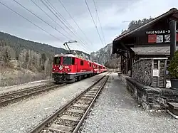 Die Bahnstrecke Reichenau-Tamins–Disentis/Mustér, auch Vorderrheinlinie, Surselvalinie oder Oberländerlinie genannt,[5] ist eine meterspurige Schweizer Schmalspurstrecke, die zum Stammnetz der Rhätischen Bahn (RhB) gehört. Sie verbindet den Bahnhof Reichenau-Tamins mit dem Bahnhof Disentis/Mustér.
