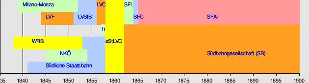 Im Friedensvertrag vom 10. November 1859 trat die österreichische Regierung ihre Pflichten und Rechte hinsichtlich der in der Lombardei gelegenen Eisenbahnen (Magenta – Mailand – Peschiera, 176 km, Mailand – Camerlata – Como, 44 km, zusammen 220 km im Betrieb, nebst einer Anzahl weiterer Konzessionen) an Sardinien-Piemont ab. Die auf österreichischem Staatsgebiet gelegenen Linien wurden von Wien, die lombardischen von Mailand aus verwaltet.