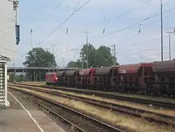 Zwischen Karlsruhe und Wörth findet reger Güterverkehr zu den Wörther Baggerseen, dem Mercedes-Benz-Werk Wörth und dem Wörther Rheinhafen statt, weshalb dieser Streckenabschnitt seit 1974 elektrifiziert ist. Vom Betriebsbahnhof Karlsruhe-Rheinbrücke zweigen Anschlussgleise zu den Raffinerien der MiRO sowie zu einem Werk von Stora Enso ab. Ersteres ist ebenfalls elektrifiziert. Entsprechend werden die dortigen Güterzüge meist elektrisch gefahren, ebenso der Güterverkehr nach Wörth.[55] Die einst zahlreichen Anschlussgleise des Bahnhofs Karlsruhe West wurden alle zurückgebaut, der Bahnhof Karlsruhe-Knielingen hat mittlerweile ebenfalls keine Anschlussgleise mehr.[56]