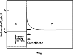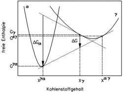 Um die Gleichgewichtskonzentration von Xγα in α bzw. Xαγ in γ zu erreichen, ist eine starke Kohlenstoffdiffusion notwendig. Dabei sinkt die freie Enthalpie der γ-Phase etwas von Gγ auf Gαγ, während die freie Enthalpie eines in α umgewandelten Volumenelements stark auf Gγα erniedrigt wird. Das Gesamtsystem senkt dabei seine freie Enthalpie um den Betrag ΔG ab. Die Triebkraft für die Umwandlung ist durch ΔGα gegeben.