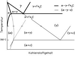 Das Ansteigen der Übergangstemperatur für kleine Kohlenstoffgehalte, wie man es beobachtet hat, rührt jedoch von der Definition her, dass die Übergangstemperatur die höchste Temperatur ist, bei der sich noch Carbid aus dem Ferrit ausscheidet. Da sich im Zuge der Bildung des oberen Bainits, besonders nach langen Umwandlungszeiten, wegen der Kohlenstoffanreicherung im Austenit und damit steigenden Übersättigung des Ferrits, durchaus auch Carbid im Ferrit ausscheiden kann, repräsentiert die gefundene Kurve nicht den Übergang der Bildungsmechanismen. Man führt vielmehr den Übergang vom oberen zum unteren Bainit auf das hypothetische Fe-ε-Carbid-Zustandsdiagramm zurück. Bild 11 zeigt, dass sich unter 350 °C Umwandlungstemperatur ε-Carbid aus dem Ferrit ausscheidet. Dementsprechend legt man die Übergangstemperatur konstant bei 350 °C unabhängig vom Kohlenstoffgehalt fest. Die Ausscheidung von ε-Carbid ist nach dieser Theorie der wichtigste Mechanismus der Bildung des unteren Bainits. Das metastabile ε-Carbid wandelt sich dann nach längeren Umwandlungszeiten in stabilen Zementit um.