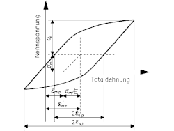 Bei elastisch-plastischer Wechselverformung liefert der Spannungs-Totaldehnungs-Zusammenhang Hysteresisschleifen,[55] denen bei hinreichend stabilisiertem Werkstoffverhalten nach Bild 17 verschiedene Kenngrößen entnommen werden können. Bei spannungskontrollierter Versuchsführung lassen sich die Totaldehnungsamplitude εa,t und die plastischen Dehnungsamplituden εa,p als Funktion der Lastspielzahl N bestimmen. Zyklische Verfestigung (Entfestigung) ist dabei mit einer Abnahme (Zunahme) von εa,p und damit auch von εa,t verbunden. Bei totaldehnungskontrollierter Versuchsführung stellen sich dagegen die Spannungsamplituden σa und die plastischen Dehnungsamplituden εa,p als abhängige Größen ein. Eine zyklische Verfestigung (Entfestigung) ist dabei mit einer Zunahme (Abnahme) von σa und einer Abnahme (Zunahme) von εa,p verknüpft.[56] Werden die abhängigen Größen bei gegebener Beanspruchungsamplitude als Funktion des Logarithmus der Lastspielzahl aufgetragen, so ergeben sich sogenannte Wechselverformungskurven. Entnimmt man diesen zugehörige Wertepaare von σa und εa,p bzw. εa,t und trägt diese gegeneinander auf, so erhält man die zyklische Spannungs-Dehnungs-Kurve. Dieser können wie einer Spannungs-Dehnungs-Kurve des Zugversuchs zyklische Streck- und Dehngrenzwerte entnommen werden.