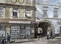 Glaswaarenhandlung der Firma E. Bakalowits auf dem Hohen Markte (Fischhof) im Jahre 1845