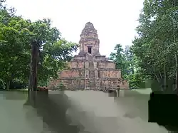 - darauf ein Prasat (Tempelturm) mit vier gleichen Fassaden, Zugang in der Ostseite, Scheintüren in den drei anderen Seiten, bestehend aus Cella (Tempelinnenraum) und vier Dachgeschossen.