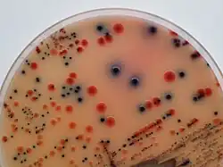 blau-violette Kolonien: Enterobakterien, die β-Galactosidase spalten (hauptsächlich Coliforme Bakterien)