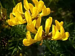 Die zwittrige Blüten ist zygomorph und fünfzählig mit doppelter Blütenhülle. Der Kelch ist glockenförmig und 4 bis 7 Millimeter lang.[1] Die gelbe Blütenkrone besitzt die typische Form einer Schmetterlingsblüte. Die genagelte Fahne ist 11 bis 16 Millimeter lang und 6 bis 8 Millimeter breit.[1][2]