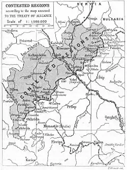 Bezüglich der Abgrenzung der serbisch-bulgarischen Ansprüche auf Mazedonien kam unter russischer Vermittlung bzw. unter Druck des Zarenreiches ein provisorischer Kompromiss zustande.[2] Es wurde eine unstrittig serbische Zone, eine unstrittig bulgarische Zone und eine verbleibende Zone vereinbart, über deren Zugehörigkeit nach dem Krieg der Zar persönlich entscheiden sollte und dessen Schiedsspruch sich beide Seiten anzuerkennen verpflichteten. Die unstrittig serbische Zone umfasste das heutige Kosovo. Die unstrittig bulgarische Zone sollte alle Gebiete einschließen, die südlich und östlich einer Linie vom bulgarisch-serbisch-osmanischen Dreiländereck bis zum Ohridsee verlief. Über das verbleibende, nördlich und östlich von Skopje und Kumanovo liegende Gebiet sollte der russische Schiedsspruch entscheiden.[3]