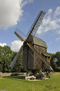 - Wenige hundert Meter nördlich des Dorfes in der Nähe des Bachlaufs der Tonna steht an der Straße Am Eselsstieg eine Bockwindmühle. Sie wurde 1834 erbaut und 1930 aus Eggersdorf zum heutigen Standort umgesetzt.[15] Alljährlich am Deutschen Mühlentag (Pfingstmontag) ist sie zur Besichtigung geöffnet. Die Mühle ist ein geschütztes Kulturdenkmal des Landkreises Gotha.[16]