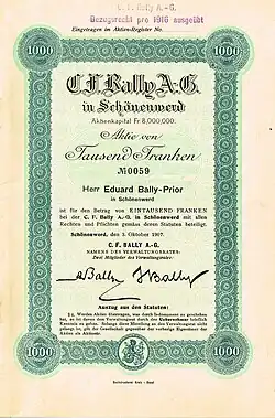 Bereits 1907 hatten Eduard und Arthur Bally die Kollektivgesellschaft «C.F. Bally Söhne» im Hinblick auf künftige Erbteilungen in eine Aktiengesellschaft umgewandelt.[19] Die Familie Bally behielt die Stimmenmehrheit der Aktiengesellschaft. Das zusätzliche Kapital erlaubte eine massive Expansion.[5] 1921 erfolgte die Gründung einer Holdinggesellschaft mit Sitz in Zürich. Diese nunmehr börsenkotierte «C.F. Bally A.G.» hielt die Beteiligungen an allen schweizerischen und ausländischen Tochtergesellschaften der Fabrikation, des Detailhandels und des Engros-Vertriebs. Die Schweizer Produktionsbetriebe wurden in der «Bally Schuhfabriken AG» mit Sitz in Schönenwerd zusammengefasst. 1951 zählte man weltweit 26 Tochtergesellschaften.[19]