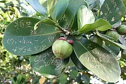 Wird das Blatt verletzt, bildet sich eine gut und lange sichtbare Narbe aus (die Blätter haben eine durchschnittliche Lebensdauer von 15 Monaten). Diese Eigenschaft hat zur Bezeichnung „Autographenbaum“ (englisch autograph tree) geführt. Zur Zeit der spanischen Kolonialherrschaft verwendeten Soldaten die von ihnen „beschrifteten“ Blätter als Spielkarten und Notizpapier. Sie wurden auch schon als Postkarten versendet.[5][6] In botanischen Gärten und öffentlichen Parkanlagen wird der Baum häufig von Personen, die ihre Graffiti hinterlassen, verunstaltet.