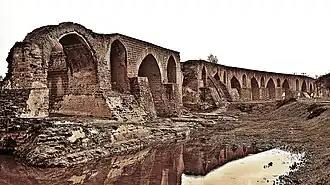 Das ungefähr 500 m lange Überfallwehr über den Karun, Irans wasserreichsten Fluss, war das Kernstück des Historischen Bewässerungssystems von Schuschtar (سازههای آبی شوشتر), eines großen Bewässerungskomplexes, auf dem die landwirtschaftliche Produktivität von Schuschtar beruhte,[5] und der 2009 von der UNESCO zum Weltkulturerbe erklärt wurde.[6] Auf dem bogenförmigen Überbau führte die wichtige Straße von Pasargadae zur sassanidischen Hauptstadt Ktesiphon entlang.[7] Die in der islamischen Epoche häufig instandgesetzte Brücke blieb bis zum späten 19. Jahrhundert in Betrieb.[8]