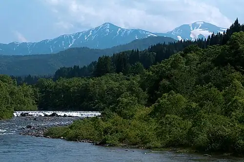 ![]() Der Fluss Sagae mit dem Koasahi-dake links und Ōasahi-dake rechts im Hintergrund | ||
