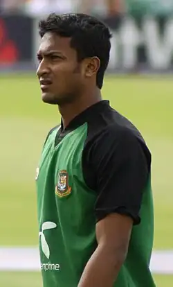 Mit dem Beginn des neuen Jahres wurde Bangladeschs All-rounder Shakib Al Hasan der beste Spieler in allen drei Cricket-Formaten. Er war der erste Spieler seit der Einführung der neuen Spielerranglisten durch das ICC, dem dies gelang.[131] Während der Gruppenphase des Cricket World Cup 2015 in Australien und Neuseeland besiegte Bangladesch im ersten Spiel Afghanistan,[132] und das folgende Spiel gegen Australien fiel aufgrund Regens aus.[133] Es verlor das Spiel gegen Sri Lanka mit 92 Runs.[134] Danach gelang Bangladesch die höchste erfolgreiche run chase in ODIs, nachdem Schottlands Vorgabe von 318 Runs eingeholt werden konnte.[135] Nach dem Sieg über England qualifizierte sich Bangladesch erstmals für das WM-Viertelfinale.[136] Dort unterlag Bangladesch gegen Indien jedoch deutlich mit 109 Runs.[137]