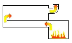 Auf der anderen Seite der Garkammer befindet sich je nach Ausführung ein kleiner Schornstein oder eine zweite vertikal angeordnete Garkammer, der sogenannte Räucherturm, der eine weitere Öffnung für den Schornstein aufweist. Durch den Schornstein entweicht der in der Feuerkammer entstehende und durch die Kammern geleitete Rauch nach außen. Die Ausführung mit seitlichem Räucherturm wird auch Chuckwagon genannt. Aus dem Gargut austretendes Fett und sonstige Flüssigkeiten werden in der Regel durch einen Ablauf im Boden der Garkammer ausgeleitet und in einem unter dem Ablauf hängenden Eimerchen, dem sogenannten Fetteimer, gesammelt.
