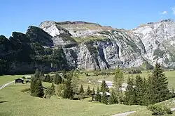Das Tal nach Bargis in Richtung Südost, aus Richtung des Piz Dolf gesehen. Links der steilen Felskante ist der Boden von Bargis zu sehen.