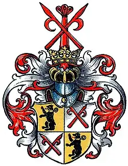 - Vermehrtes Wappen von 1721: Quadrierter Schild, die Felder 1 und 4 in Gold ein sitzender schwarzer Bär, Felder 2 und 3 in Silber zwei ins Andreaskreuz gestellte rote Hakenlanzen. Auf dem gekrönten Helm die gekreuzten roten Hakenlanzen vor einer roten mit roten Federn besteckten Säule. Die Helmdecken in rot-silber.