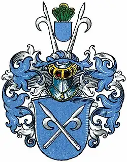 - Stammwappen: In Blau zwei ins Andreaskreuz gestellte, silberne Hakenlanzen. Auf dem blau-silber bewulsteten Helm zwei nach außen geneigte Hakenlanzen, dazwischen ein leerer blauer mit grünen Pfauenfedern besteckter Schild. Die Helmdecken in blau-silber.