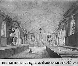 Die erste barocke Pfarrkirche St. Ludwig wurde vermutlich von Festungsingenieuren in den Jahren 1685 bis 1687 mit einer flächigen, dreiteiligen Fassade in der Art römischer Tempel errichtet. Ein Grundrissplan aus dem Jahr 1847 hat sich im Trierer Bistumsarchiv erhalten, ebenso existiert eine Innenraumansicht aus dem Jahr 1834. Die Kirche hatte eine Länge von 146 Fuß, das Schiff hatte eine Breite von 42 Fuß und das Querschiff eine Breite von 72 Fuß (6 Pariser Fuß = 1,95 m).[7] Damit war St. Ludwig die größte Kirche in der Umgebung. Die Nalbacher Kirche zählte in der Länge 124 Fuß, die Beruser 110 Fuß, die Fraulauterner 107 Fuß und die Rodener 101 Fuß.[8]