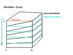Die Isopyknen- (Flächen gleicher Dichte) und Isobarenflächen (Flächen gleichen Druckes) stehen hier zueinander geneigt und schneiden sich. Die Isobarenflächen sind in geringen Tiefen parallel zur Meeresoberfläche. Mit zunehmender Tiefe nimmt ihre Neigung jedoch ab, da die mittlere Dichte der Wassersäule über dem Punkt A größer ist als über B. Da die Isobarenflächen mit der Tiefe immer horizontaler werden, nimmt der Druckgradient und mit ihm verbunden die geostrophische Strömung immer weiter ab, bis, wenn die Isobarenoberflächen ab einer gewissen Tiefe horizontal sind, keine geostrophischen Strömungen mehr vorhanden sind.