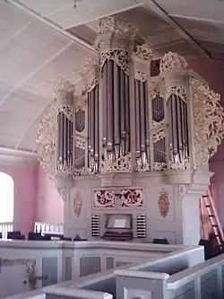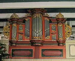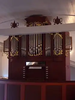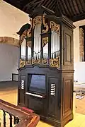 I | 5 | Orgel eines unbekannten deutschen Orgelbauers (1765); Aufteilung in Bass/Diskant zwischen b und h; Gedact 8′ in Eiche, Principal 4′ im Prospekt, Quinte 3′, Octave 2′, Terz 13/5′ |